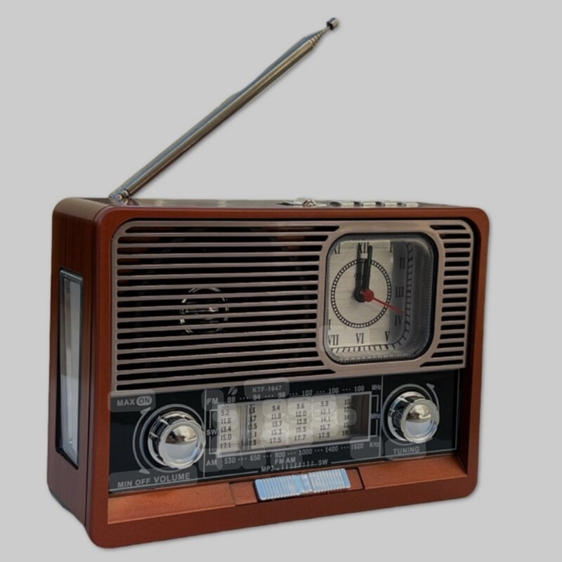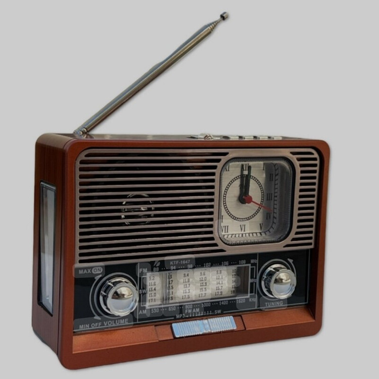 رادیو ktf 500گرم سایر اقلام همراه محصول کابل شارژ امکانات و قابلیتها دارای ساعت، چراغ قوه LED بلوتوث،رادیو،فلش، مموری میکرو آنتن تلسکوپی، خروجی هدفون کارت حافظه TF پورتAUX. فناوریهای ارتباطی بلوتوث پورت USB. امواج دریافتی FM. AM. SW. کارت حافظه قابل اتصال Micro SD. منبع انرژی درگاههای ارتباطی پورت USB.