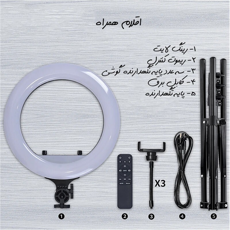 وزن 300 گرم ویژگی ها نوردهی 360درجه دارای سه عدد نگهدارنده گوشی ریموت کنترل جهت تنظیم نور قابلیت شارژ گوشی از طریق درگاه USB (یک عدد درگاه) سه پایه بلند زاویه نوردهی 360 درجه دمای رنگ 2700-6500K تعداد چراغهای LED 300