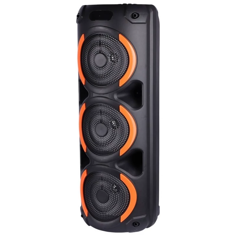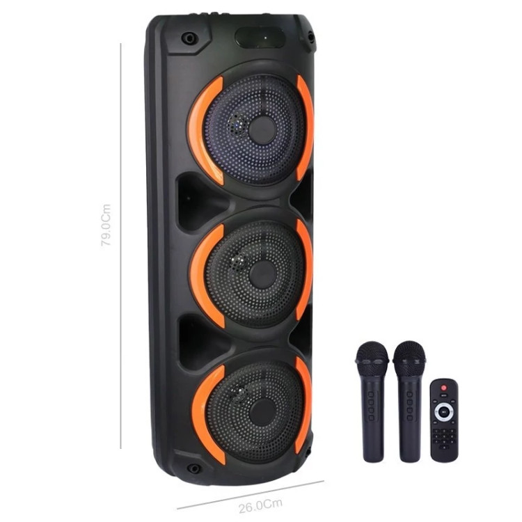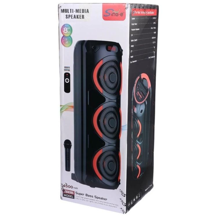 برخورداری از کلید های فیزیکی به منظور مدیریت موسیقی، تنظیم ولوم، نورپردازی، اکو و ... پخش فایل های ذخیره شده دلخواه با پشتیبانی از فلش مموری USB و کارت حافظه MicroSD دارای 3 عدد درایو 8 اینچی با توان خروجی کلی 60 وات (20W×3)، برخورداری از یک عدد ورودی میکروفون اتصال بی سیم از طریق بلوتوث با برد اتصال تقریبی 10 متر و اتصال با سیم توسط رابط جک 3.5 میلی متری صدا اقلام همراه محصول شامل دو عدد میکروفون، ریموت کنترل و کابل تایپ سی، دارای استاندارد سلامت محصول CE/ FCC/ RoHS دارای نورپردازی داخلی جهت ایجاد جلوه بصری زیبا در محیط کم نور و تاریک، مجهز به نمایشگر LED جهت اطلاع از وضعیت کارکرد